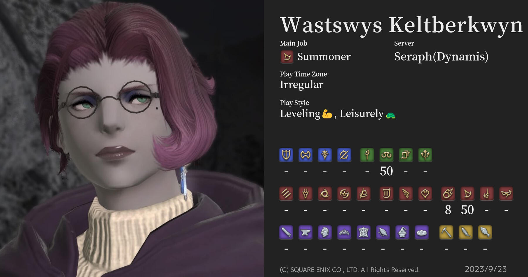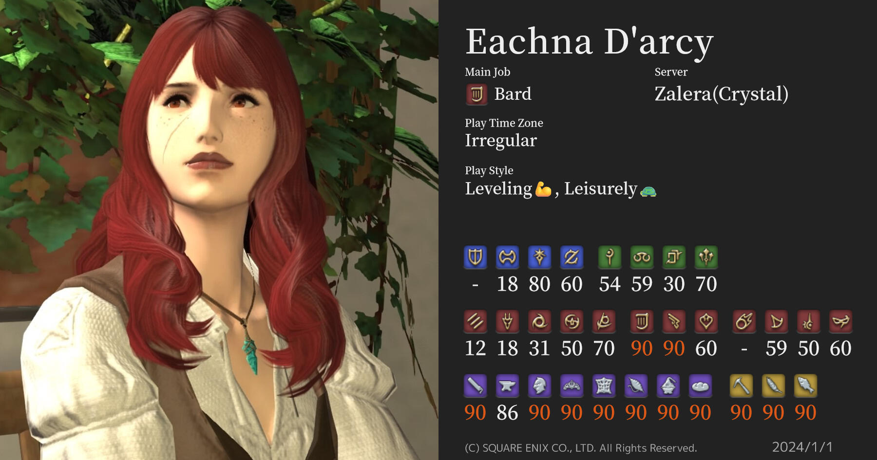 For most of her life, Eachna’s world stretched as far as the forest.As an infant, Eachna was rescued from a Garlean-occupied military zone and placed into the protective custody of one Awyrward Roeheidinsyn, a brilliant—and painfully shy—Sharlayan engineer. Roeheidinsyn’s aversion to society had long ago prompted him to trade his scholarly career for a peaceful hermitage in the wilds near Abalathia’s Spine. There, he could live out the end of his natural life in solitude and self-sufficiency while continuing his research into Allagan robotics. These plans changed when Kakayo Kayo—then using the name Tuturi Turi—arrived on his doorstep with the infant in tow.Roeheidinsyn agreed to care for the child until arrangements could be made for her to be placed in the care of Galuf Baldesion. But as time passed, he began to develop paternal feelings for her and decided to raise her as his own. He christened her Eachna, giving her the traditional Sea Wolf surname of Awyrwardwyn as well as a Hyuran surname.In the years that followed, Roeheidinsyn devoted his research towards the goal of imbuing an Allagan node with his aether, much in the manner of royal clones. The experiment was a success, and by the child’s third nameday Roeheidinsyn’s memories—and a good deal of his aether—were transferred into an inactive defense node. His body did not survive the process, but the now-sentient orb was able to continue raising his daughter in total isolation. He was her sole companion: parent, playmate, and protector.Eachna’s world was no taller than the mountain peaks, no wider than the gleaming band of the White Maiden on the farthest horizon. The lush foliage was her playground, the creatures of the forest her playthings. By the age of eight she was proficient with a bow, hunting meals from the safety of the pine boughs. The long hours of playtime were interspersed with a routine timetable of classes, as Roeheidinsyn insisted on giving his child a “proper” Sharlayan education despite the obvious setbacks of living in the wilds.Eachna’s first sight of the outside world was, ironically enough, Garlean; she caught sight of the Agrius as it sailed overhead on its way to the Battle of Silvertear Skies. As she grew from a rambunctious child to a boisterous woman, she found herself yearning to travel and experience the places she’d read about in the books and maps littering her family cottage.Roeheidinsyn knew that the forest would not always sate her appetite for adventure, but he attempted to temper her excitement with cautions of Eorzea’s many dangers. To his chagrin, this only served to further rouse his daughter’s curiosity.Eachna’s small world shattered during the Seventh Umbral Calamity, when the night sky burned with countless falling stars. The sight awoke the concept of anguish within her, a grief so strong that it consumed her entirely. A voice in her head spoke until her ears rang, a pounding ache erupting behind her eyes that left her staggering in pain. That night, snow began to fall where it had never fallen before. By week’s end, the green forest was buried beneath ice sheets thicker than man’s forearm. The glacial winter had begun.The youth of nineteen winters, who had once been so sunny, was now silent and withdrawn. She weathered the eternal winter, but she did not thrive. Her pale face thinned as rations grew scarce, her laughter exchanged for pensive silence and somber smiles. For five years she managed to survive the snow, but on her twenty-fourth nameday she announced her decision to travel to the Gridanian Archer’s Guild. As a child of Oschon, she hoped to hone her skills before traveling the world in search of answers.Who was this voice that called to her in dreams? Who implored her to hear, to think, to feel?She vowed she would not rest until she learned all there was to know.